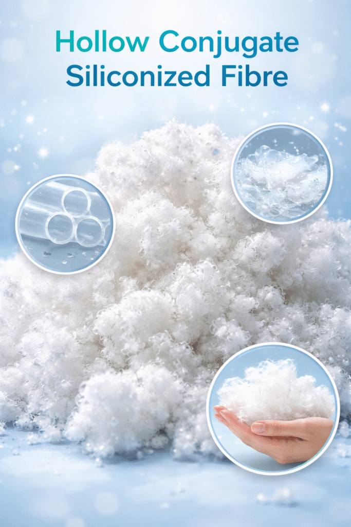 Manufactures and supplies premium Hollow Conjugate Siliconized Fiber (HCS) — a highly resilient, virgin/recycle-grade polyester fiber known for its softness, bounce, and silky finish. The hollow core and conjugate crimp give the fiber enhanced loft and recovery, while the siliconized coating ensures smoothness and flowability.Clothing – inside jackets, coats, and quilted garments for insulation